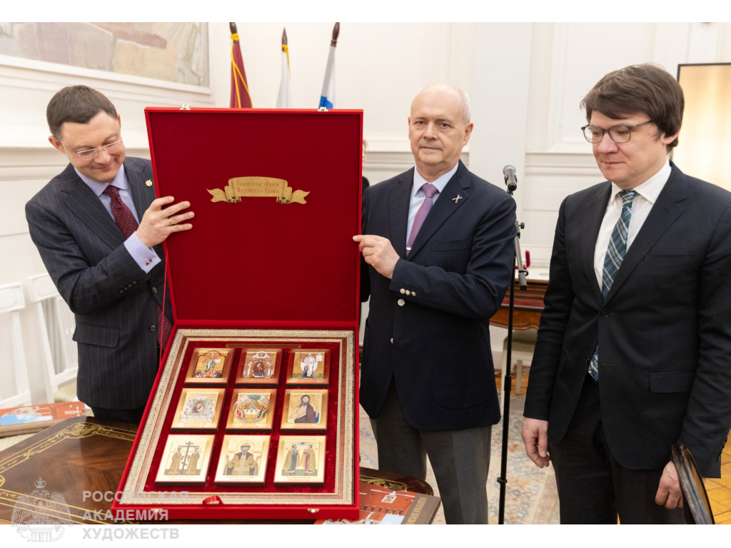 В знак признательности за внимание к проекту и поддержку деятельности по сохранению историко-культурного наследия от Фонда Андрея Первозванного Президенту Российской академии художеств был вручен памятный набор икон с копиями Надвратных икон Московского Кремля.