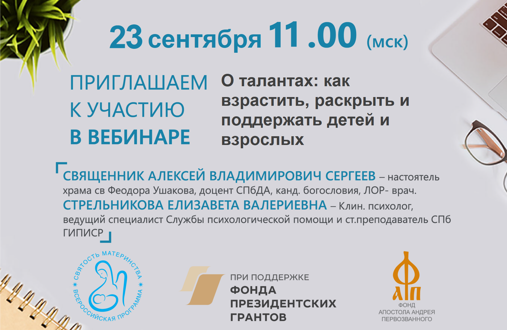 23 сентября 2025 года в 11.00 мск, в рамках курса вебинаров «Здоровье семьи: современные медицинские, психолого-социальные, этические аспекты» Всероссийской программы «Святость материнства» пройдет вебинар «О талантах: как взрастить, раскрыть и поддержать детей и взрослых»