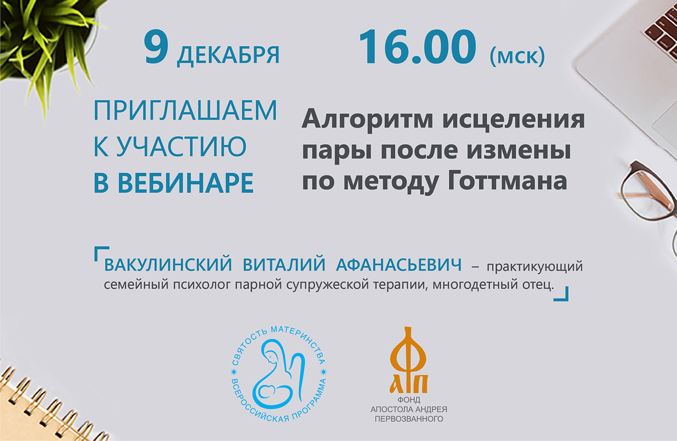 9 декабря 2025 года в 16:00 мск, в рамках курса вебинаров «Здоровье семьи: современные медицинские, психолого-социальные, этические аспекты» Всероссийской программы «Святость материнства» пройдет вебинар на тему: «Как превратить травму измены в возможность построить новые, более прочные отношения».
